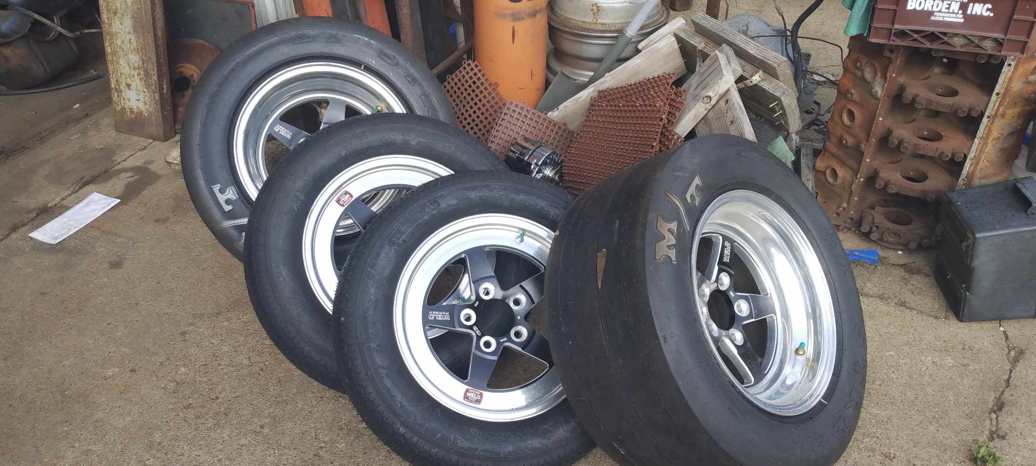 Weld Forged RT-S wheels and Mickey Thompson tires, racing, set of 4, front tires 26 x 7.5 x 15LT, rear 26 x 11.50x 15LT, mounted and balanced, wheel part front #71MB-504B15A , rear #71MB-510A65A , 2 front, 2 rear, wheel size 15 x 4.075 , 15 x 10.33, BC 5 x 4.5, fits Ford and Chrysler, new, $2900